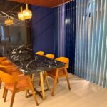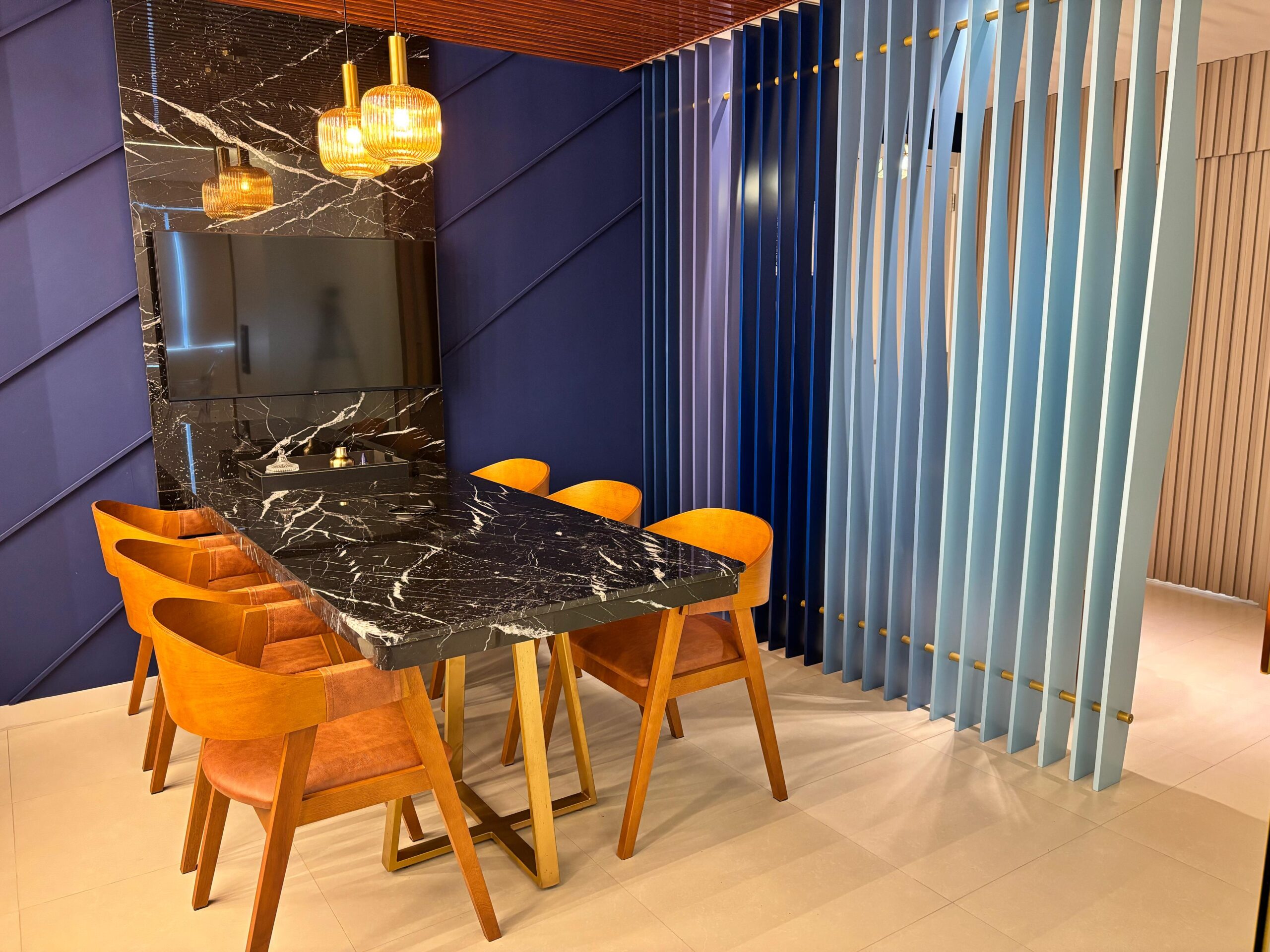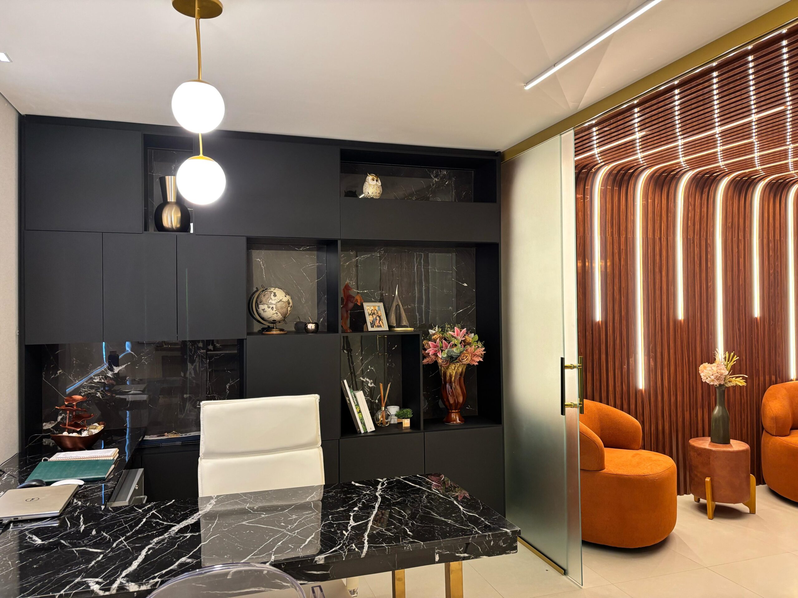 O projeto, que utiliza materiais como pau-ferro, mármore Nero Marquina e tons de azul que remetem ao universo náutico, foi pensado para ir além da estética. A sede integra elementos sensoriais, funcionais e simbólicos, que transformam o ambiente em mais uma ferramenta de comunicação para relacionamento com os clientes e produção de conteúdo.